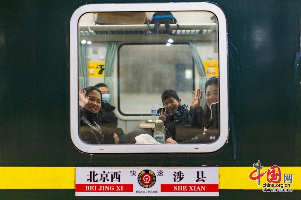 乘坐春運首日北京地區(qū)首趟普速列車K5207次的乘客向記者微笑揮手。中國網記者 鄭亮攝