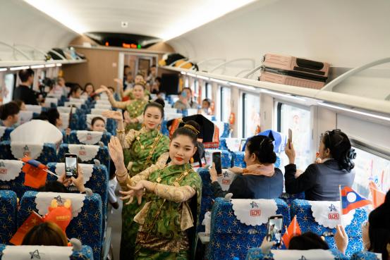 中老鐵路項(xiàng)目被譽(yù)為“高質(zhì)量共建‘一帶一路’的標(biāo)志性工程”。2023年4月13日,中老鐵路從昆明南站、萬象站雙向?qū)﹂_國際旅客列車。越來越多的旅客選擇乘坐中老鐵路動車跨境旅行。本次列車迎新音樂會邀請到了中老兩國的歌手、舞蹈演員、樂手匯聚一堂,共同演繹了《自由之地》、《 一路同行》、《新春序曲》、《敬酒歌》等多首中老兩國名曲,為乘坐列車的旅客們帶來了一場音樂盛宴,同時也送上新春美好的祝福。