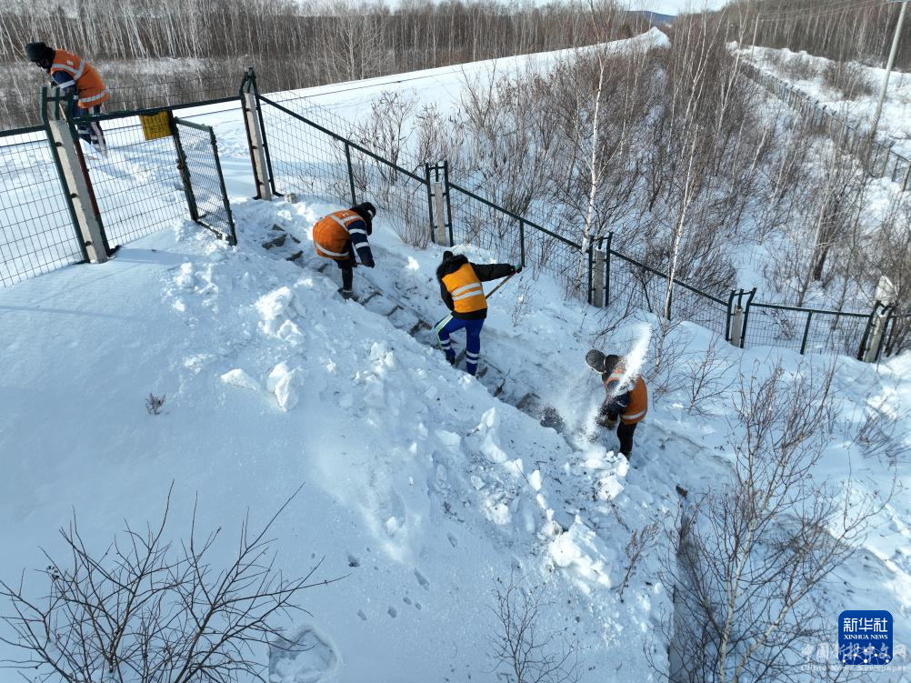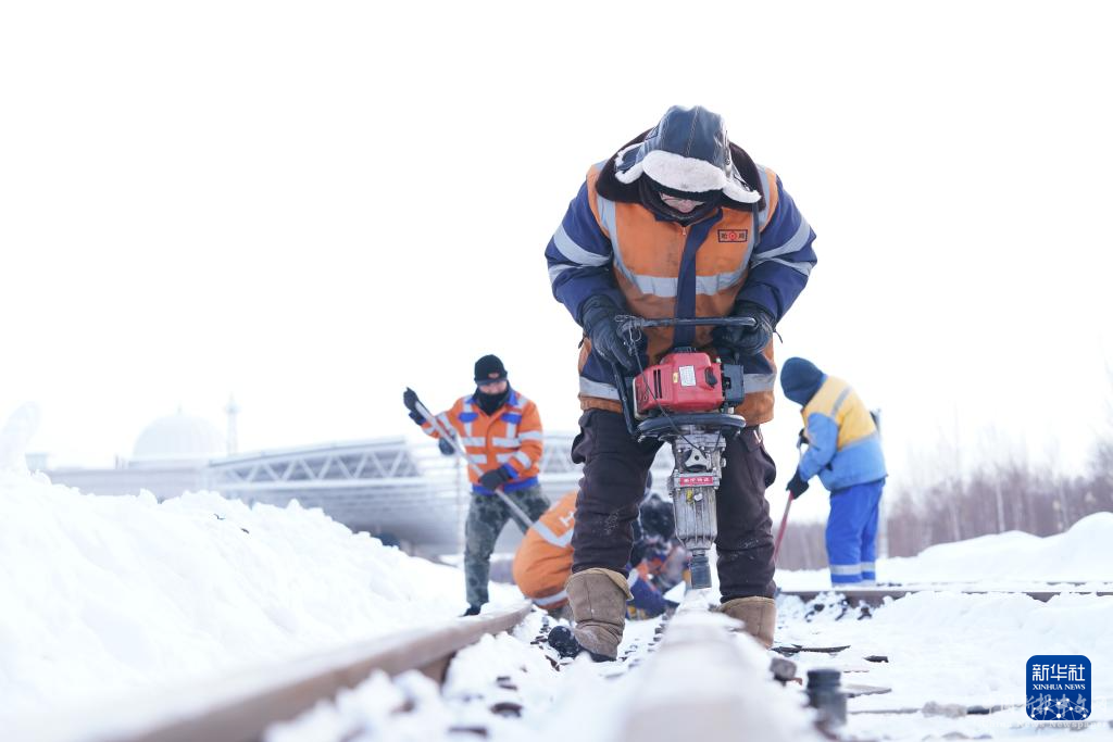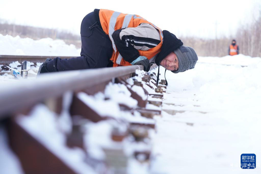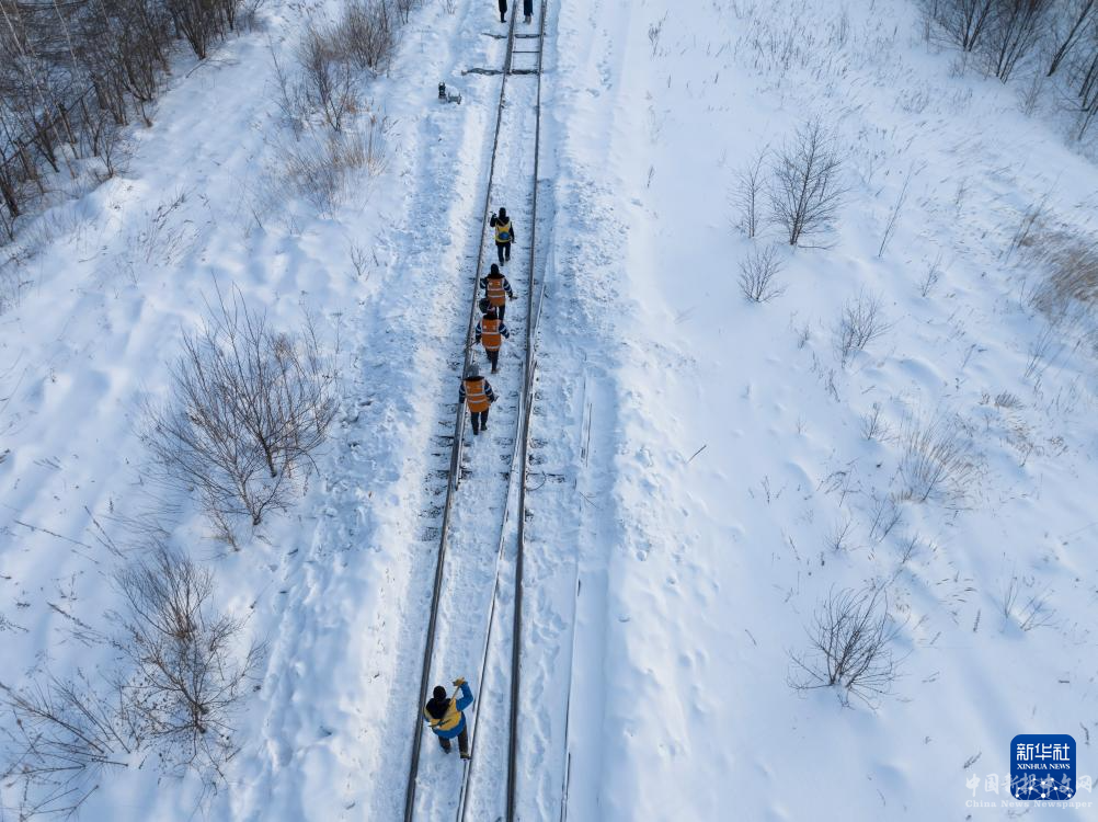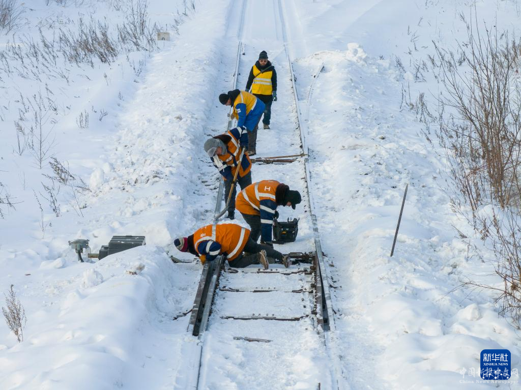 1月23日,在撫遠(yuǎn)站附近,中國(guó)鐵路哈爾濱局集團(tuán)有限公司佳木斯工務(wù)段前進(jìn)鎮(zhèn)線路車間撫遠(yuǎn)工區(qū)班組成員進(jìn)行冬季線路凍害檢修作業(yè)。