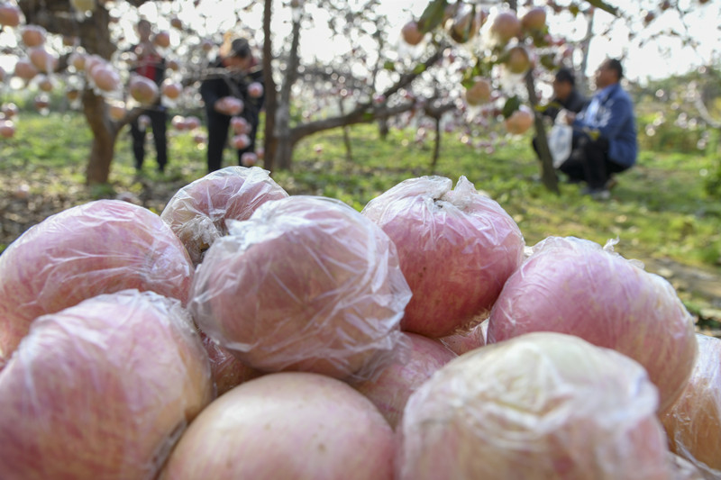 濟(jì)源市邵原鎮(zhèn)史家腰村農(nóng)民在果園釆摘富硒蘋果。新華社發(fā)(苗秋鬧攝)