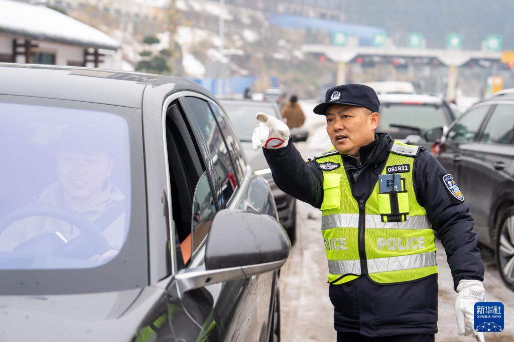 2月6日,在湖南長張高速慈利東收費(fèi)站附近,交警解答滯留旅客的提問。新華社記者 陳思汗 攝