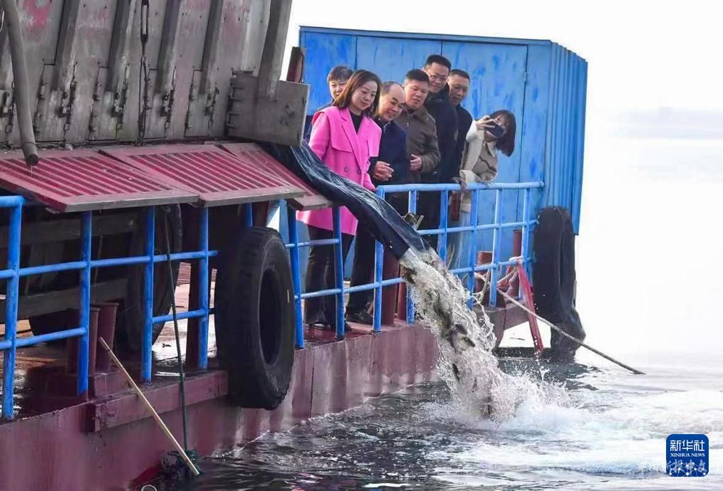 王瓊(左一)與來自武漢市農(nóng)業(yè)農(nóng)村局、武漢市禁捕辦以及武漢養(yǎng)殖企業(yè)的相關(guān)人員一同來到位于湖北省石首市的天鵝洲白鱀豚國家級自然保護(hù)區(qū),為長江江豚送來“過冬口糧”(2023年12月28日攝)。