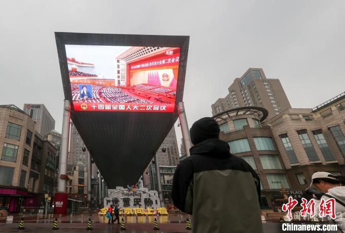 3月5日,十四屆全國人大二次會議在北京人民大會堂開幕。圖為北京一戶外大屏播放開幕會。中新社記者 賈天勇 攝