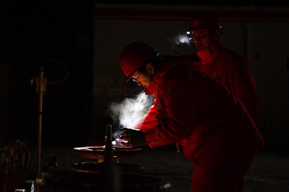 2023年12月22日晚,在陜西省延安市安塞區(qū),中國(guó)石油長(zhǎng)慶油田分公司第一采氣廠作業(yè)七區(qū)工作人員在巡檢天然氣輸氣設(shè)備。新華社記者 張博文攝