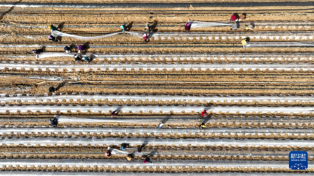 3月31日,河北省唐山市豐南區(qū)錢營鎮(zhèn)中石各莊村農(nóng)民為剛剛種植的紅薯覆膜(無人機(jī)照片)。