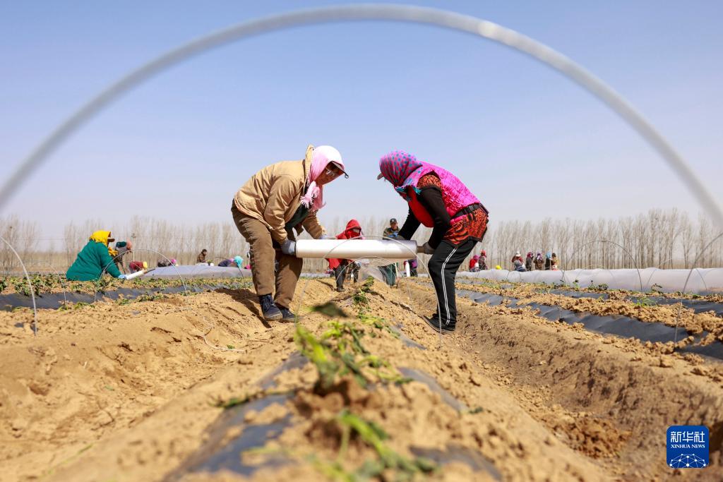 3月31日,河北省唐山市豐南區(qū)錢營鎮(zhèn)中石各莊村農(nóng)民為剛剛種植的紅薯覆膜。