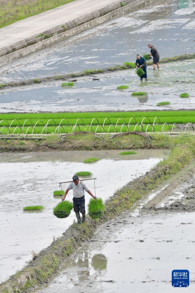 3月31日,在湖南省婁底市雙峰縣井字鎮(zhèn)花橋村,農(nóng)民在田間拋秧。