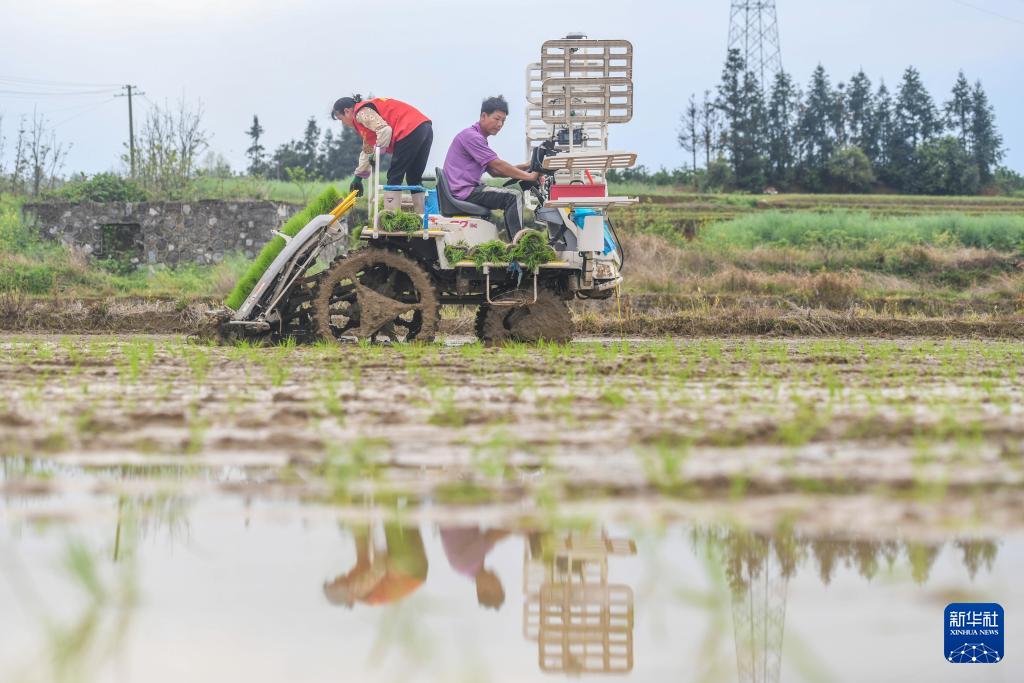 3月31日,在湖南省永州市道縣蚣?jí)捂?zhèn)合興村,和豐農(nóng)機(jī)專業(yè)合作社員工駕駛機(jī)械開展早稻插秧作業(yè)。