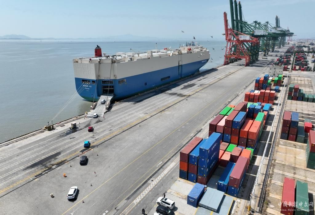 3月12日,準(zhǔn)備出口的車輛從福州港江陰港區(qū)碼頭駛上遠(yuǎn)洋滾裝輪(無人機(jī)照片)。新華社記者林善傳攝