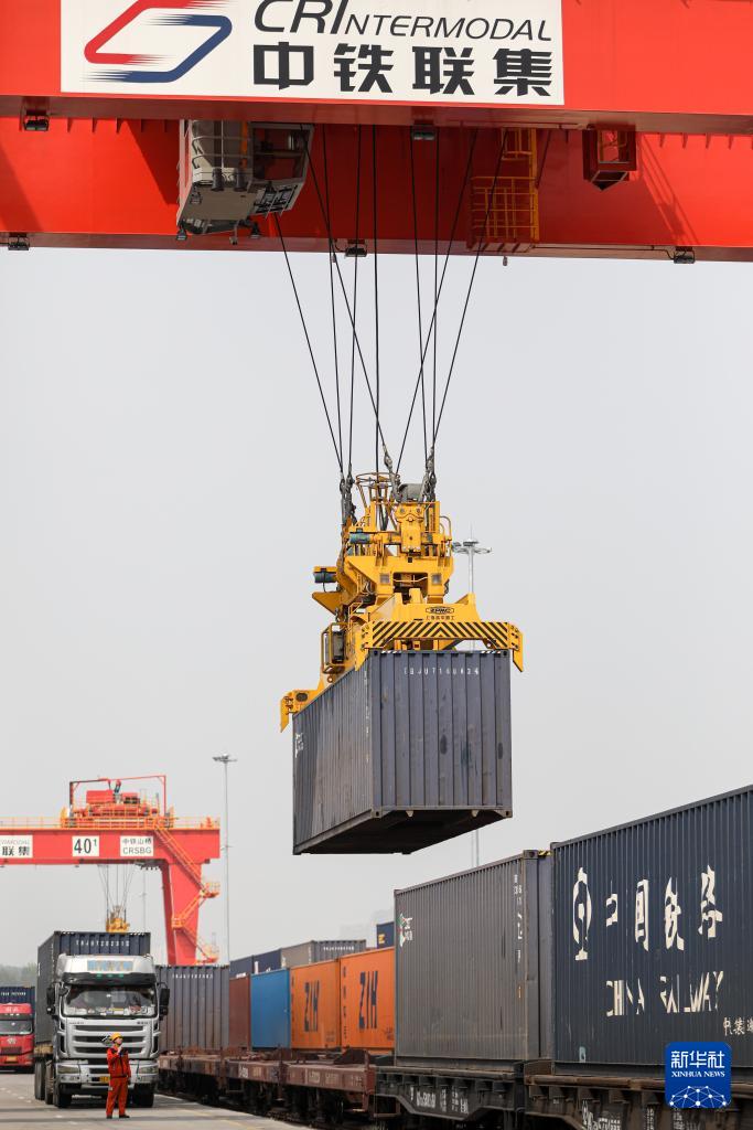 4月11日,在國(guó)鐵集團(tuán)鄭州局圃田站,中鐵聯(lián)集的龍門(mén)吊向貨運(yùn)列車(chē)上裝載集裝箱。