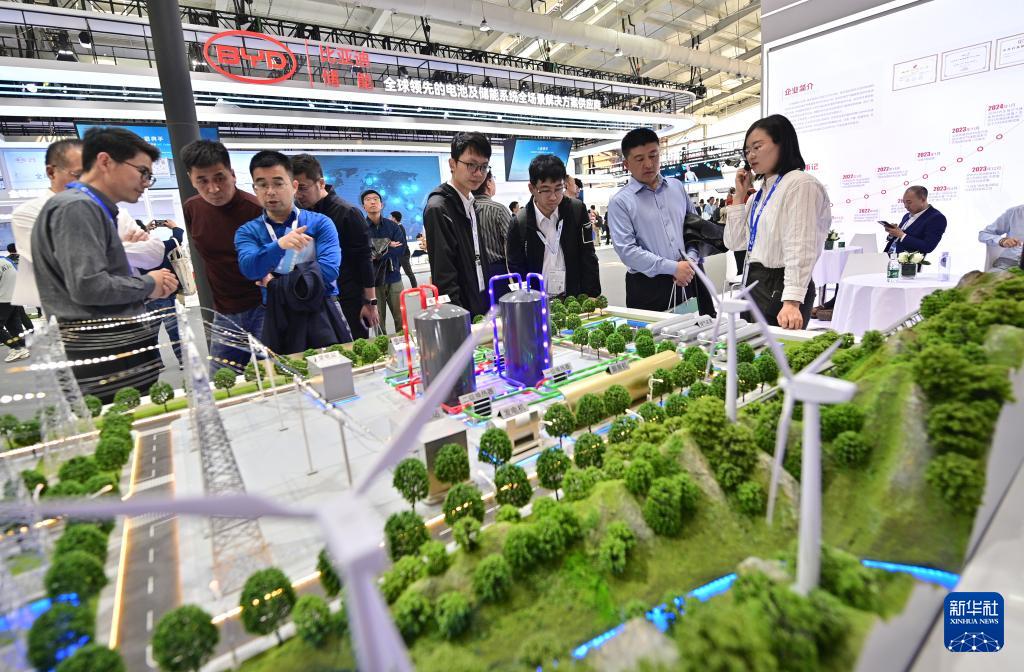 4月11日,參觀者在第十二屆儲(chǔ)能國(guó)際峰會(huì)暨展覽會(huì)上了解中儲(chǔ)國(guó)能的壓縮空氣儲(chǔ)能系統(tǒng)。