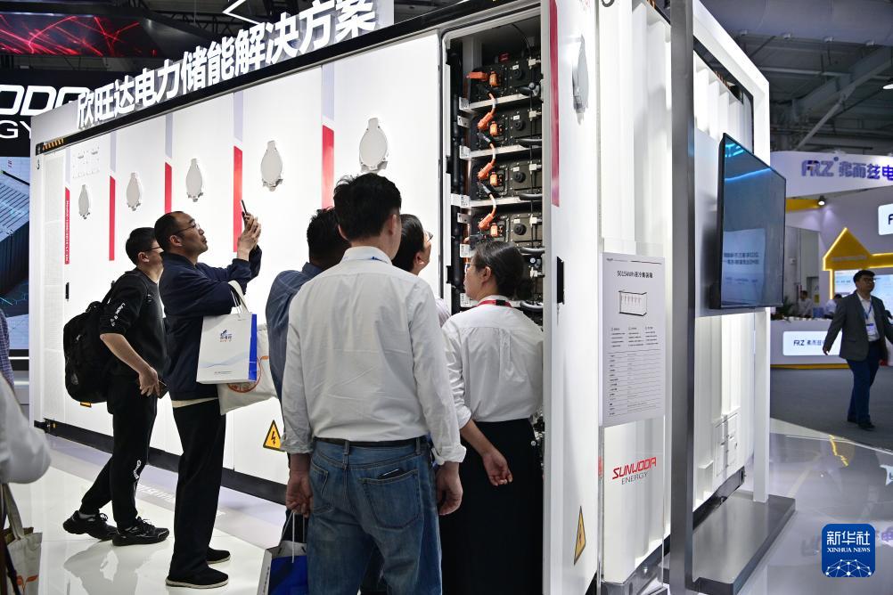 4月11日,參觀者在第十二屆儲(chǔ)能國(guó)際峰會(huì)暨展覽會(huì)上了解欣旺達(dá)電力儲(chǔ)能解決方案。
