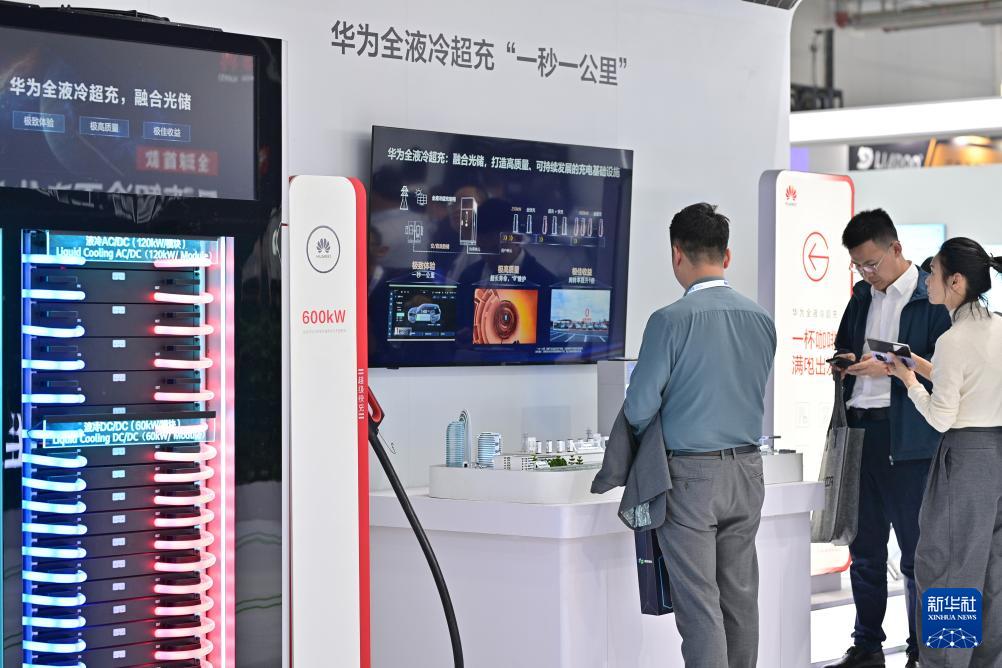 4月11日,參觀者在第十二屆儲(chǔ)能國(guó)際峰會(huì)暨展覽會(huì)上了解華為全液冷超充系統(tǒng)。