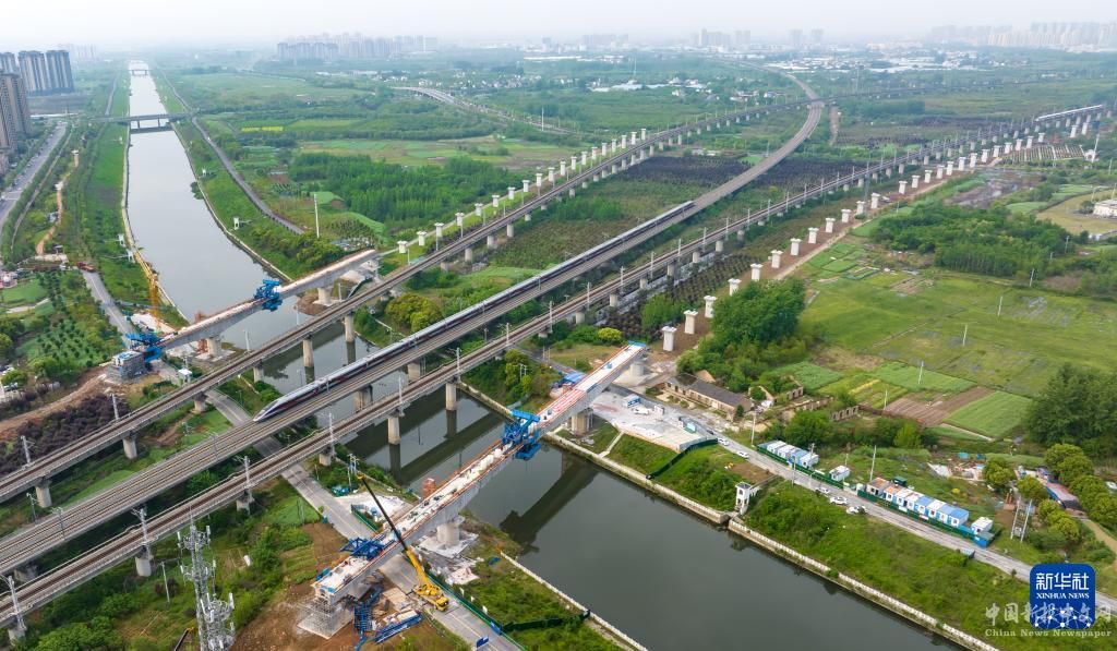 這是新建滬寧合高鐵引入合肥樞紐工程跨店埠河特大橋連續(xù)梁合龍現(xiàn)場(4月21日攝,無人機照片)。