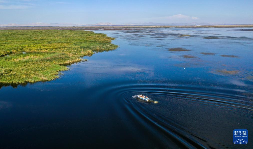 在內(nèi)蒙古烏梁素海湖面上,河湖濕地水環(huán)境保護(hù)與修復(fù)技術(shù)研究團(tuán)隊(duì)成員乘坐快艇去采集湖水樣本(2023年9月15日攝,無人機(jī)照片)。新華社記者 連振 攝