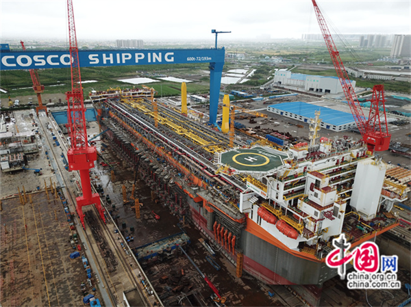 2023年5月19日,江蘇省南通市啟東海工船舶工業(yè)園,正在建造世界最大噸位級新型海上浮式生產(chǎn)儲卸油船。(無人機照片)新華社圖片庫/新華社記者 馬寧 攝