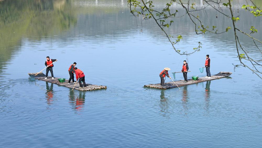 浙江省臺(tái)州市仙居縣步路鄉(xiāng)黨員志愿者與河長一起在永安溪巡河護(hù)水,清理雜物垃圾(2024年3月20日攝)。新華社發(fā)(王華斌攝)