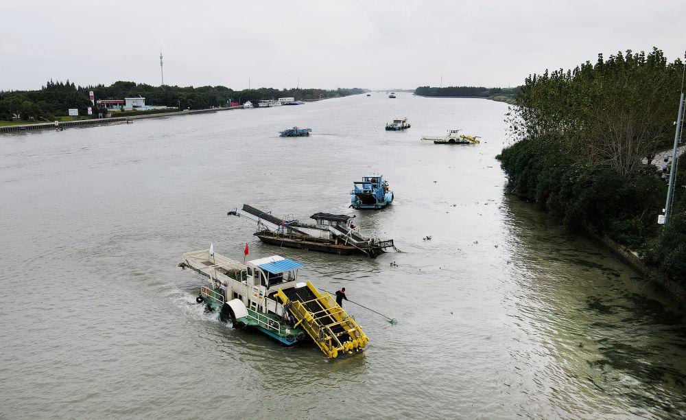 蘇浙滬三地的保潔船在蘇浙滬交界水域太浦河流域聯(lián)合清理水面浮游植物(2020年10月15日攝,無人機(jī)照片)。新華社記者 方喆 攝