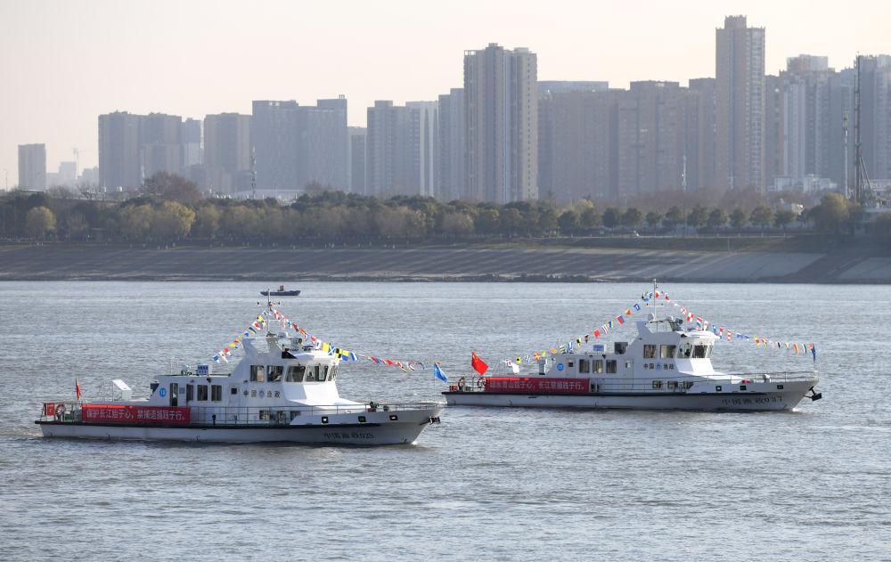 漁政執(zhí)法船隊(duì)從長江武漢段江面駛過,啟動(dòng)長江流域重點(diǎn)水域“十年禁漁”(2020年12月31日攝)。新華社記者 程敏 攝
