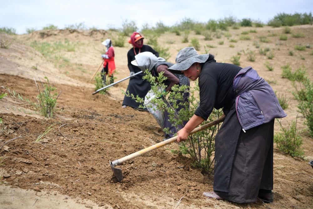 牧民在甘肅省甘南藏族自治州瑪曲縣歐拉鎮(zhèn)黃河沿岸一處沙化草原治理點(diǎn)補(bǔ)種草籽(2023年7月6日攝)。新華社記者 方欣 攝