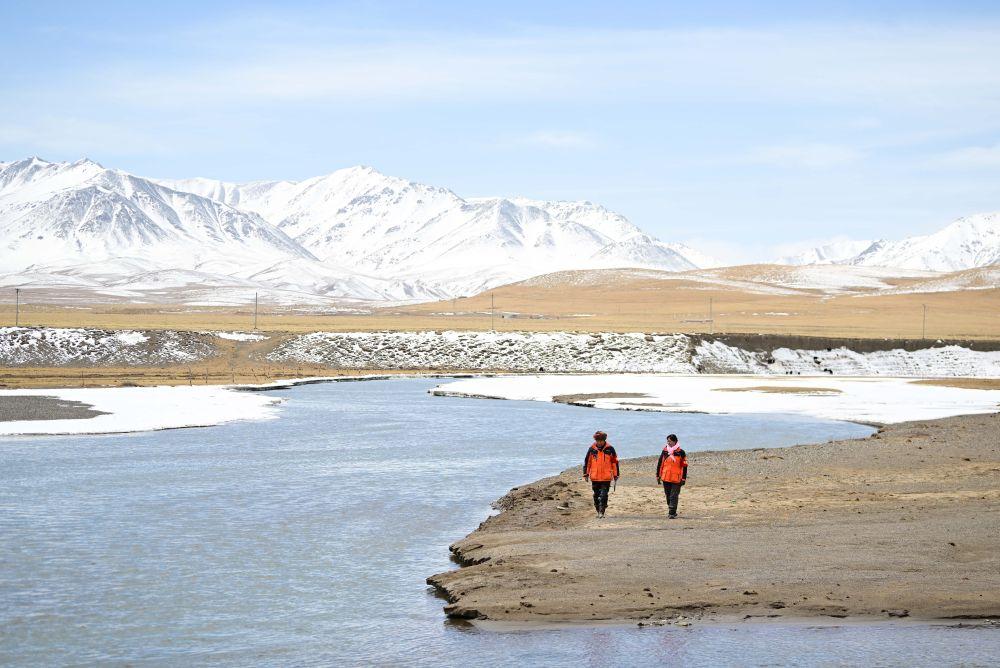 生態(tài)管護(hù)員葉金俄日(左)與東木措夫婦在青海省海北藏族自治州祁連縣的黑河流域巡護(hù)(2024年3月21日攝)。新華社記者 張龍 攝