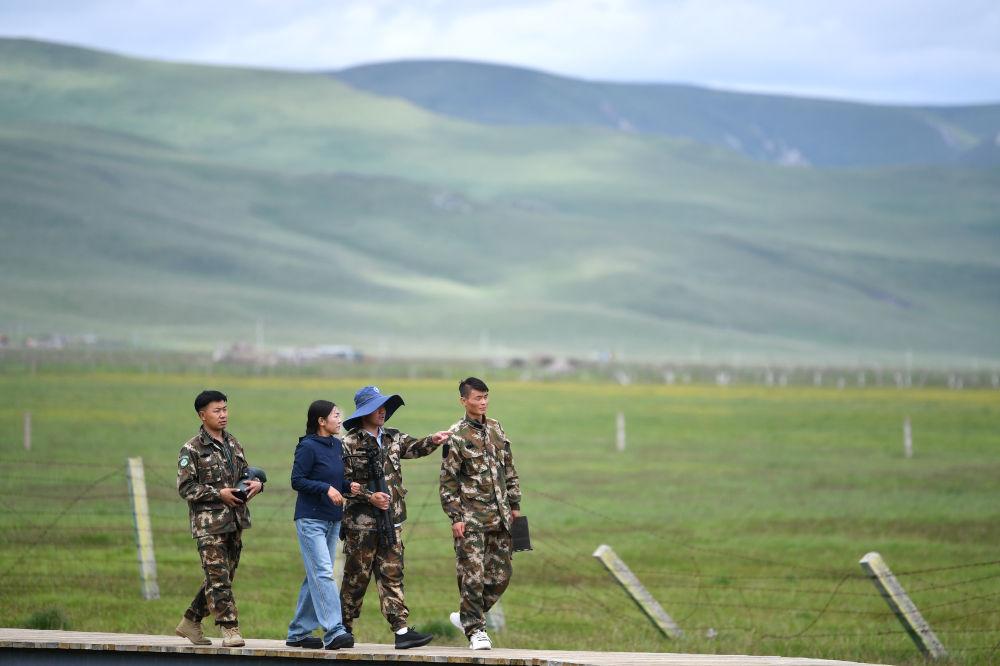 在位于甘肅甘南藏族自治州的尕海則岔國家級(jí)自然保護(hù)區(qū),管護(hù)中心尕海保護(hù)站的工作人員在保護(hù)區(qū)內(nèi)巡護(hù)(2023年7月7日攝)。甘肅省甘南藏族自治州是黃河、長江上游重要的水源涵養(yǎng)和補(bǔ)給區(qū),擁有世界上保存最完好、生態(tài)功能最完善的濕地之一。新華社記者 陳斌 攝