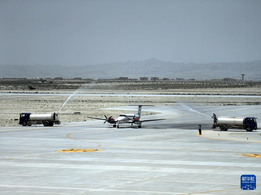 6月4日,在位于巴基斯坦瓜達爾的瓜達爾新國際機場,校飛試驗成功著陸的飛機接受“水門禮”。