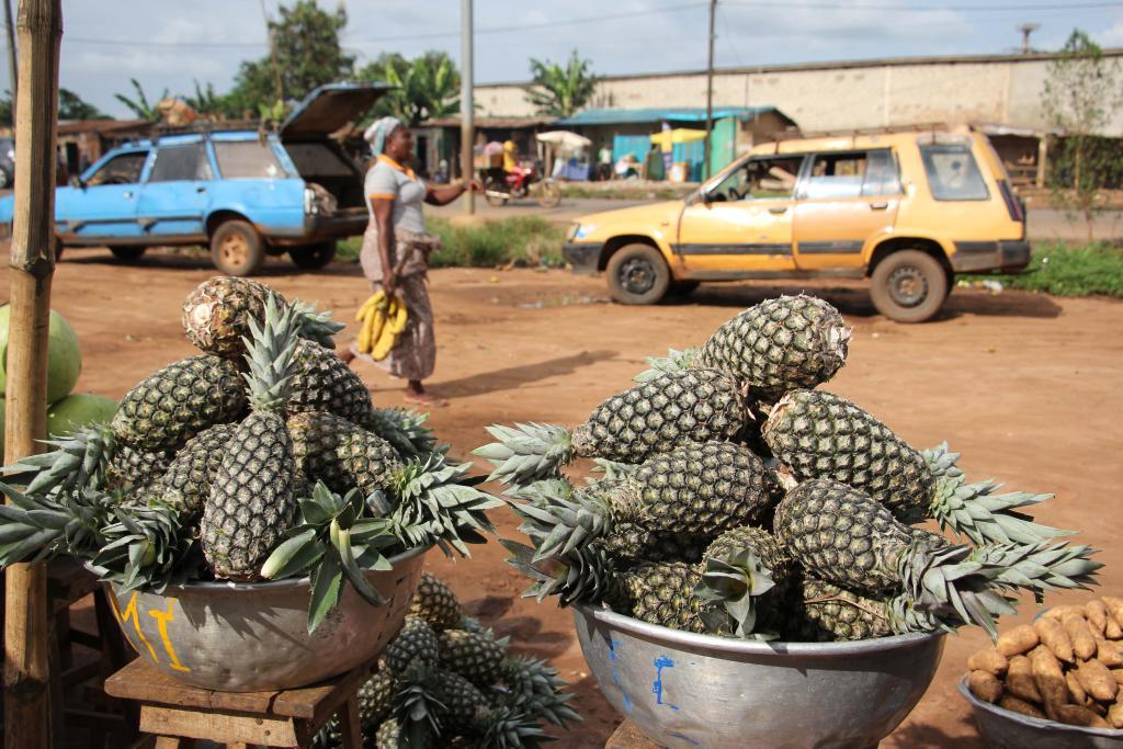 2023年10月23日,這是在貝寧“甜面包”菠蘿主產(chǎn)區(qū)澤鎮(zhèn)一家水果攤拍攝的菠蘿。“甜面包”菠蘿是貝寧首個獲得非洲知識產(chǎn)權(quán)組織認證的地理標志產(chǎn)品。在第六屆中國國際進口博覽會上,空運來華的1000公斤貝寧“甜面包”菠蘿首次與中國公眾見面。新華社發(fā)(塞拉芬攝)