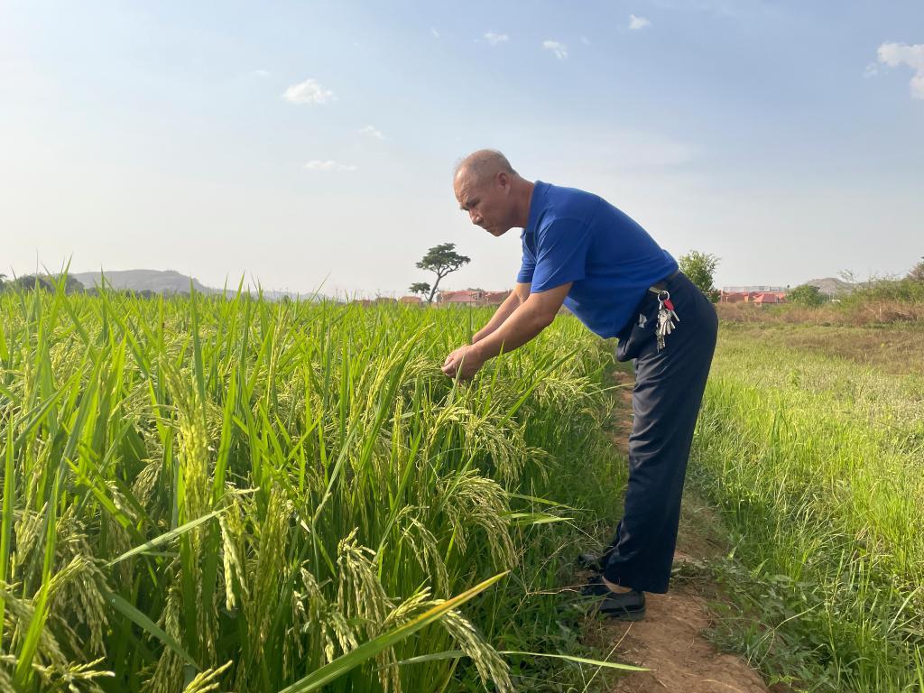 2024年3月27日,綠色農(nóng)業(yè)西非有限公司中國農(nóng)業(yè)技術(shù)專家李太龍在尼日利亞阿布賈近郊的一個農(nóng)場查看稻穗長勢(手機照片)。新華社記者楊喆攝
