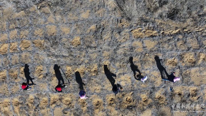 治沙工人在位于毛烏素沙地邊緣的寧夏靈武白芨灘國家級(jí)自然保護(hù)區(qū)栽植檸條(2024年3月19日攝,無人機(jī)照片)。新華社記者 王鵬 攝