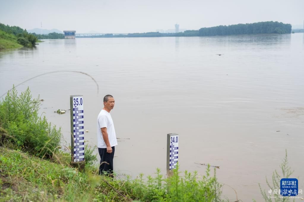 6月18日,在長沙市天心區(qū)南托垸水位標(biāo)尺處,應(yīng)急管理局工作人員在巡查。