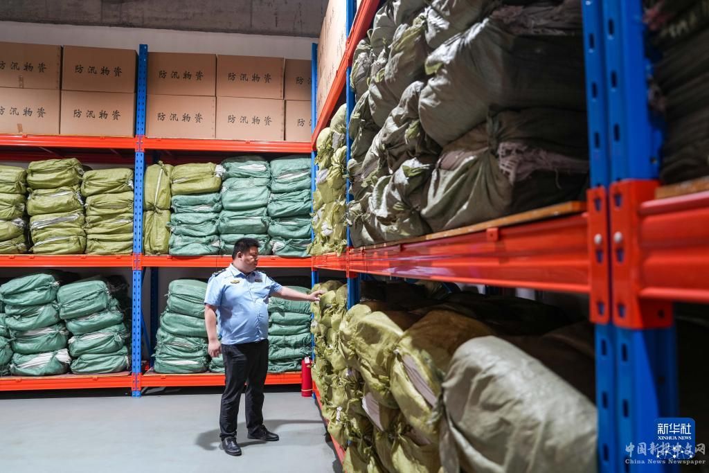 6月18日,在長沙市天心區(qū)防汛物資倉庫,應(yīng)急管理局工作人員在檢查防汛物資。