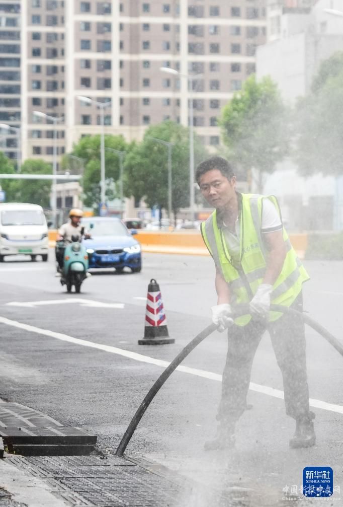 6月18日,在長沙市天心區(qū)書院南路,市政設(shè)備維護(hù)中心工作人員在清理雨水口。