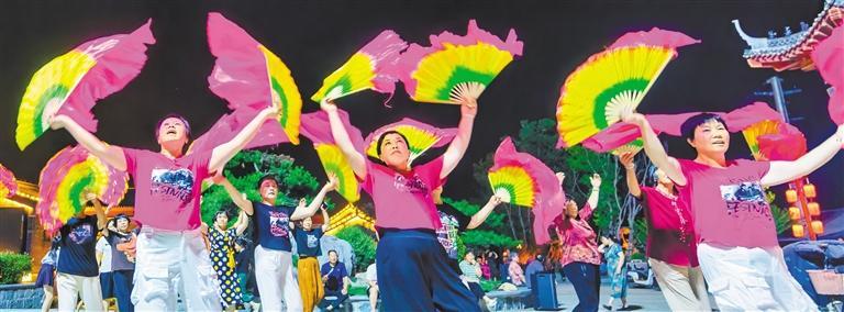 7月11日,村民在朱村好日子廣場(chǎng)跳起廣場(chǎng)舞。從“支前模范村”到綠水青山、文明和諧的富裕村,朱村人的日子一天比一天好。