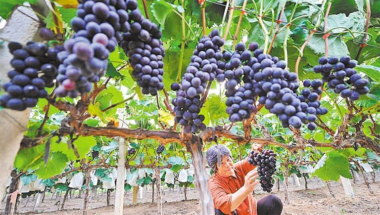 7月11日,農(nóng)戶在朱村葡萄科技示范園采摘葡萄。朱村整合村莊周邊河道、荒灘、荒地,規(guī)劃建設(shè)朱村現(xiàn)代農(nóng)業(yè)示范園,打造“好日子”系列農(nóng)產(chǎn)品品牌,年可實(shí)現(xiàn)產(chǎn)值3200萬元。