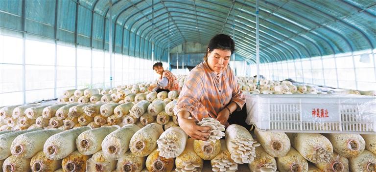 7月12日,農(nóng)戶在“好日子”示范區(qū)山前村采摘平菇。依托朱村現(xiàn)代農(nóng)業(yè)示范園,片區(qū)培育發(fā)展了綠珍食用菌、珍珠苑等多家合作社,有力帶動(dòng)了當(dāng)?shù)剞r(nóng)戶發(fā)展。