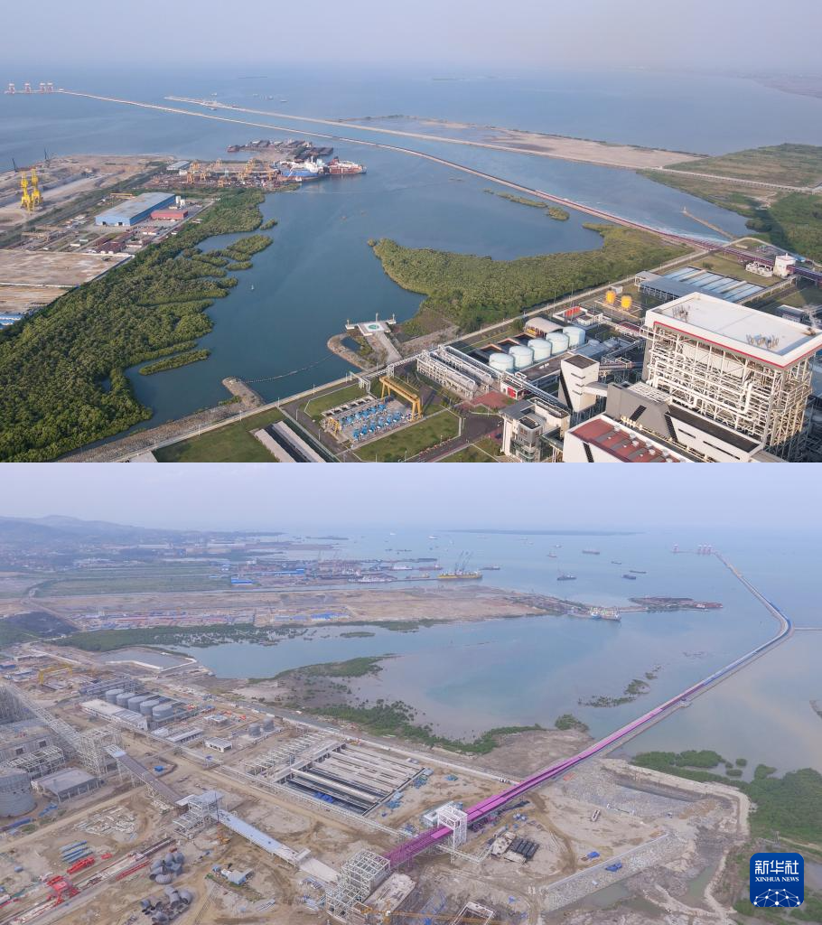 拼版照片:上圖為2024年7月15日在印度尼西亞萬丹省西冷爪哇7號(hào)項(xiàng)目附近海域拍攝的紅樹林(無人機(jī)照片,新華社記者徐欽攝);下圖為2019年1月28日在印度尼西亞萬丹省西冷爪哇7號(hào)項(xiàng)目附近海域拍攝的紅樹林(無人機(jī)照片,國能印尼爪哇發(fā)電公司供圖)。