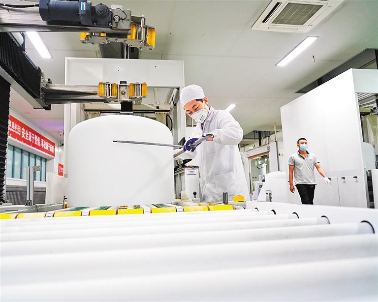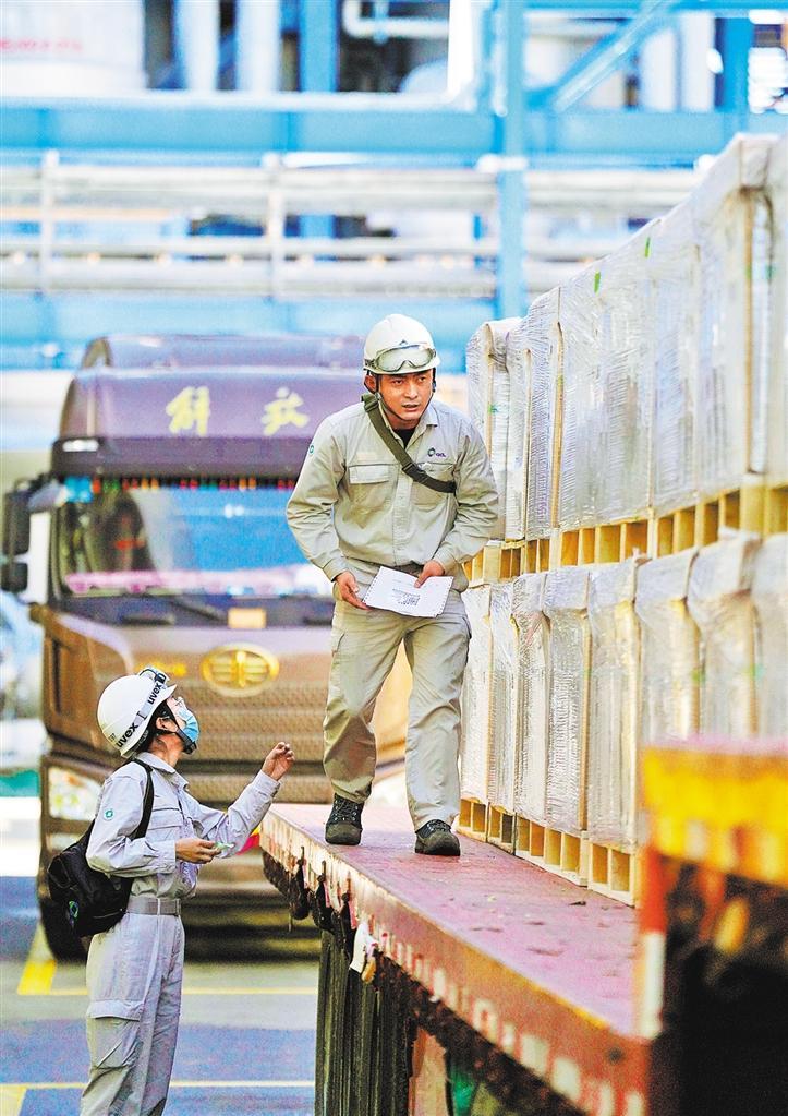 7月16日,內(nèi)蒙古鑫環(huán)硅能科技有限公司員工在智能一體化倉(cāng)庫(kù)前核對(duì)產(chǎn)品信息。該公司落戶中環(huán)產(chǎn)業(yè)園,填補(bǔ)了呼和浩特市光伏產(chǎn)業(yè)鏈上游原材料領(lǐng)域的空白。