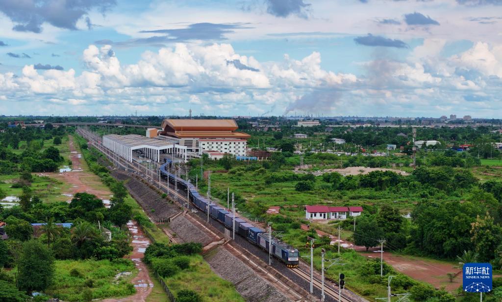 8月5日,由老撾籍火車司機獨立駕駛的滿載貨物的列車駛出萬象站,向中國昆明進發(fā)(無人機照片)。