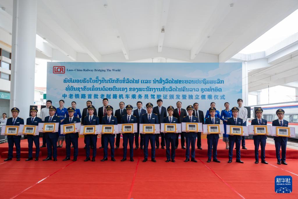 中老鐵路機車駕駛證頒發(fā)暨獨立乘務首發(fā)儀式5日在中老鐵路萬象站舉行,中老鐵路火車首次實現(xiàn)由老撾籍火車司機獨立值乘。