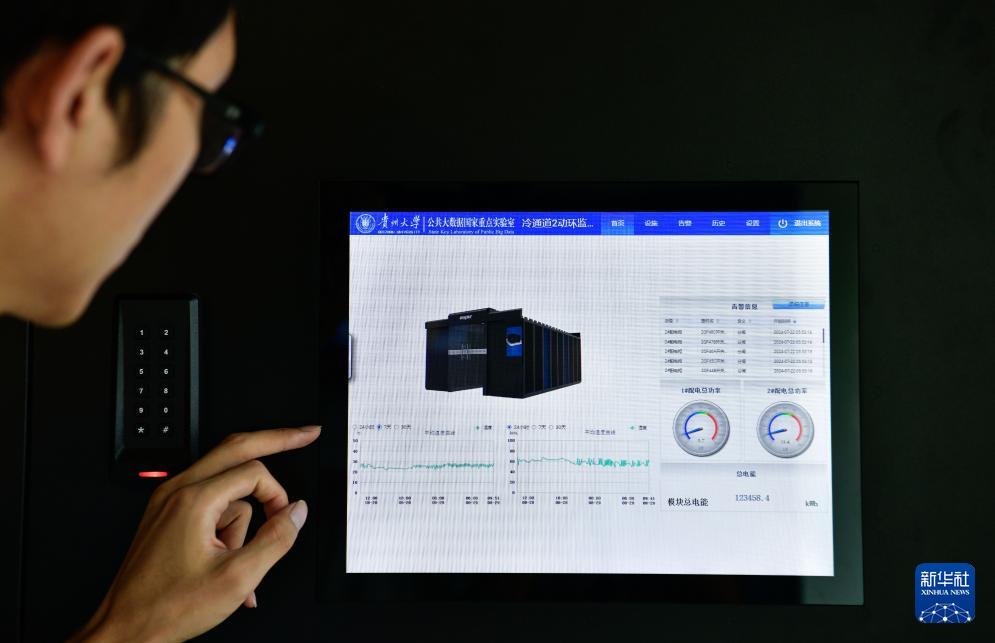 8月29日,工作人員在貴州大學(xué)省部共建公共大數(shù)據(jù)國家重點(diǎn)實(shí)驗(yàn)室算力中心檢查微模塊動(dòng)態(tài)環(huán)境監(jiān)測(cè)系統(tǒng)運(yùn)行情況。
