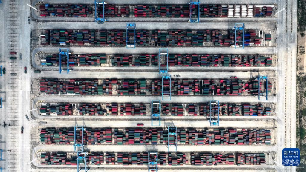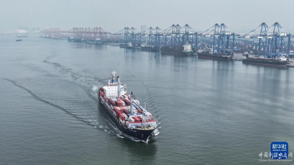 9月14日,一艘滿載集裝箱的海輪駛離欽州港碼頭(無人機照片)。