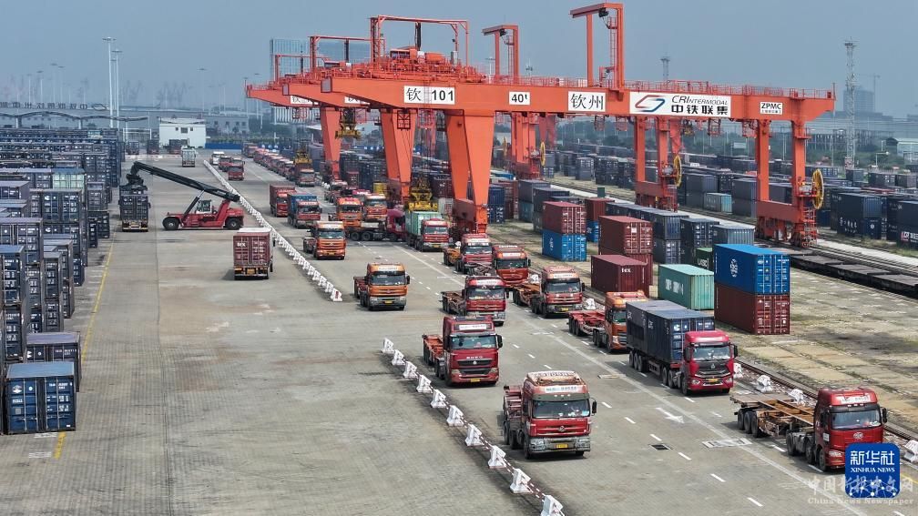 9月14日,在欽州鐵路集裝箱中心站,貨車在排隊轉運集裝箱(無人機照片)。