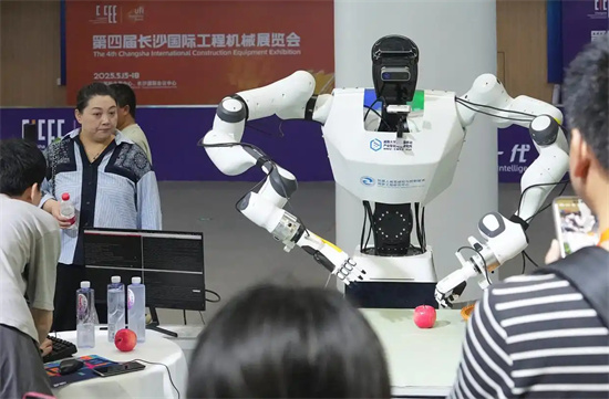 第四屆長(zhǎng)沙國(guó)際工程機(jī)械展覽會(huì)現(xiàn)場(chǎng)觀看人形機(jī)器人演示。