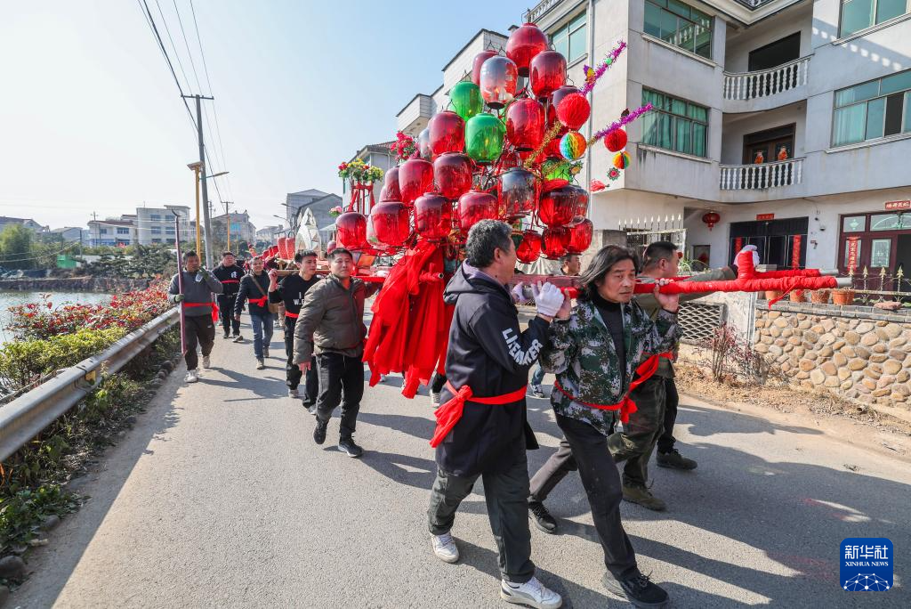 2月10日,赤松鎮(zhèn)虎巖村村民抬著板凳龍?jiān)诖謇镅灿巍?/p>