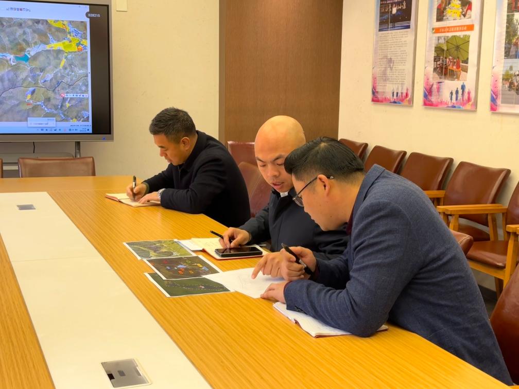 汪玉成(中)與同事討論“瀑布咖啡”選址規(guī)劃。新華社記者鄭可意 攝