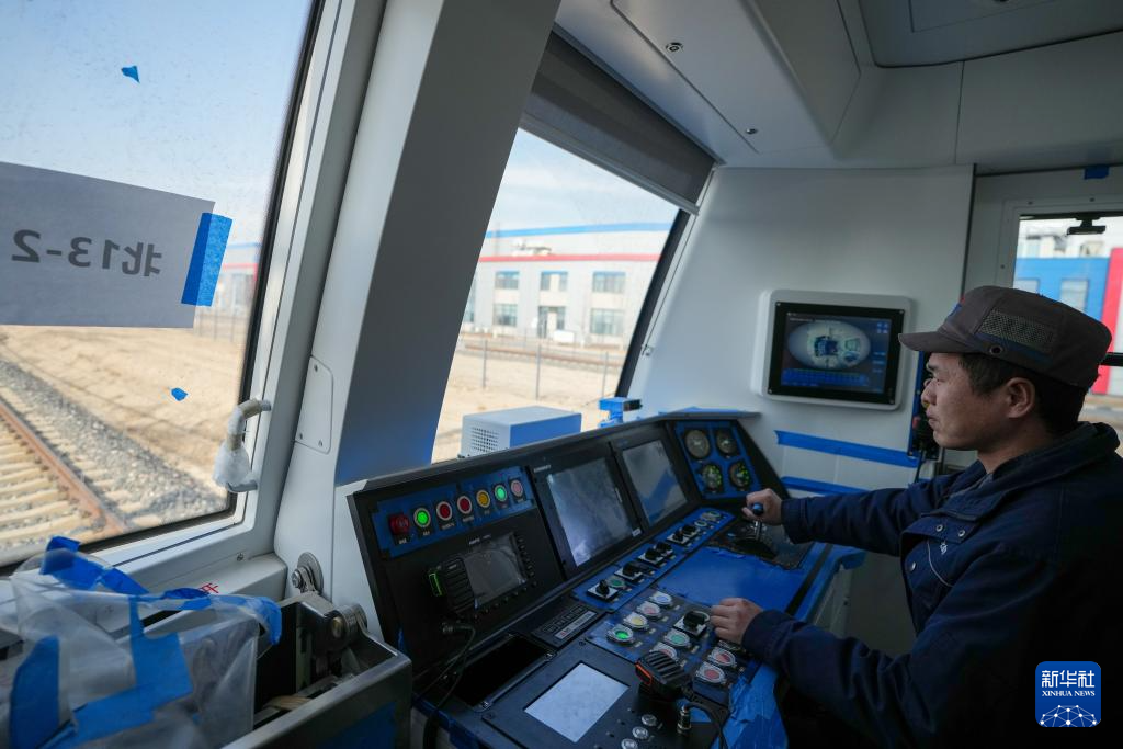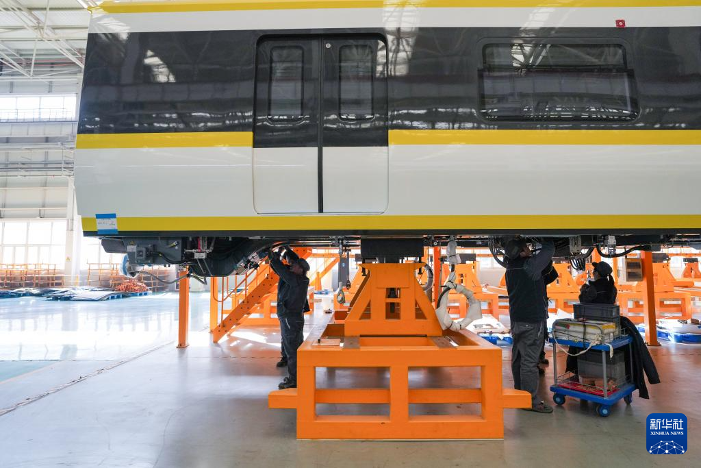 在京投裝備河北京車智能制造基地內(nèi),工作人員在進(jìn)行北京地鐵13號(hào)線新款地鐵列車的調(diào)試工作(2月14日攝)。