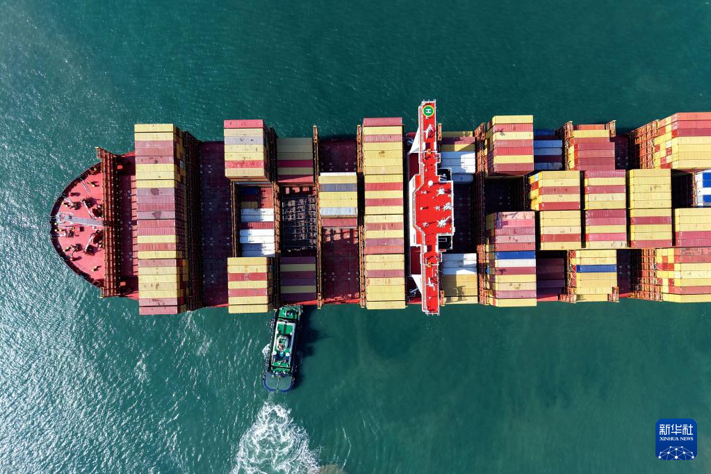 2月23日,山東港口青島港,一艘裝載集裝箱的貨輪駛離港口(無人機(jī)照片)。