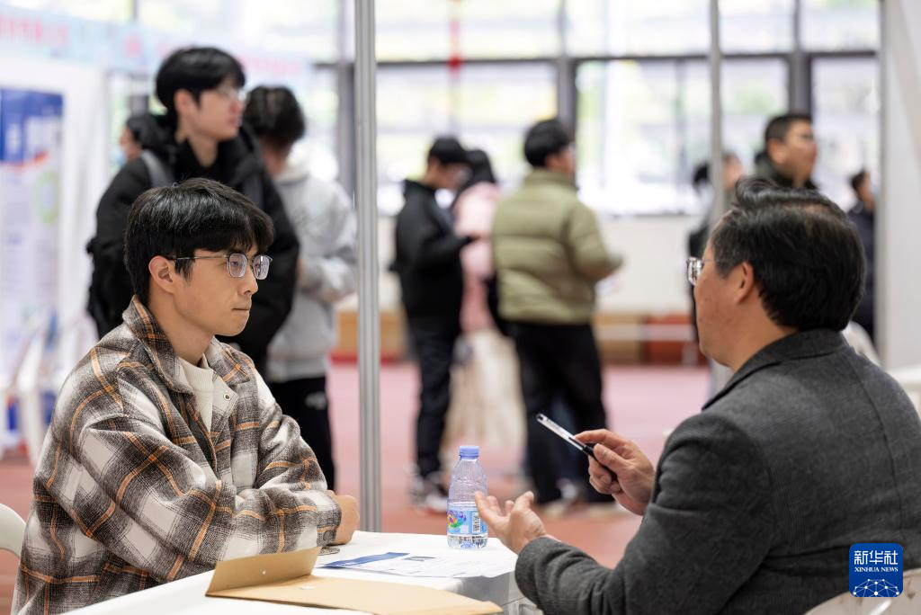 2月23日,在“海峽啟航”百家央企招聘會(huì)現(xiàn)場,一名高校畢業(yè)生(左)在向用人單位工作人員了解企業(yè)情況。