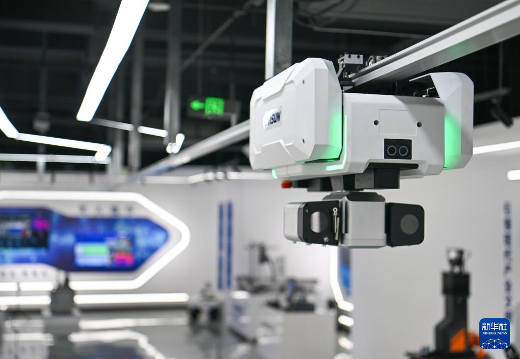 在位于京津中關(guān)村科技城的天津新松智能科技有限公司拍攝的一款軌道式無人值守機器人(2月20日攝)。